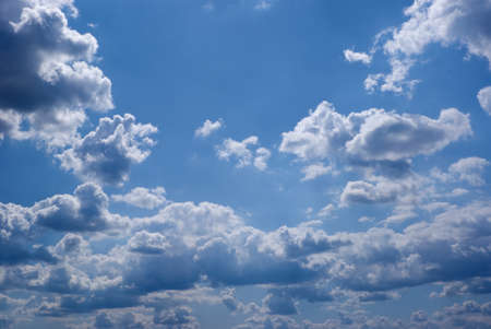 White clouds against a bright blue sky. Change from clear sunny weather to cloudy. Wallpaper for news about weather forecast. Clearing after rain. Religious appeal to the Almighty. Feeling of infinity