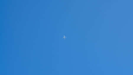 A beautiful shot of a white airplane flying and leaving its trail in the clear blue sky
