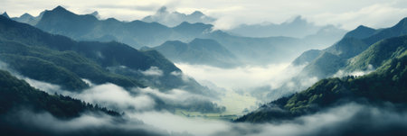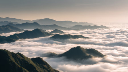 Experience the calm beauty of layered mountains enveloped in mist during sunrise. This enchanting landscape captures nature's tranquility and captivating scenery.