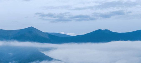 Fog in mountains before sunrise, mountain valley with clouds. View to mountains of the Carpathians.