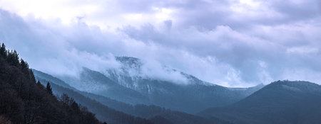 foggy clouds on snowy mountains, Cindrel mountains, Romania