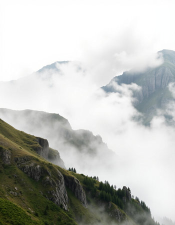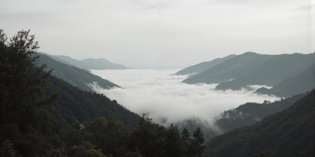 Experience the breathtaking beauty of a misty mountain landscape, where fog gently rolls over hills and trees, creating a serene and tranquil natural scene.