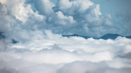Top of the mountain among the clouds. Beautiful cloudy sky. Mountain landscape of Turkey.