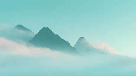 A breathtaking view of majestic mountains rising through soft mist under a clear blue sky, offering a tranquil escape into the heart of nature's beauty.