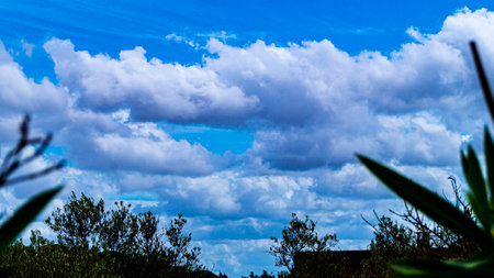 A view od daylight and over all clouds under the blue sky. Blue sky and clouds wallpaper concept. High quality photo