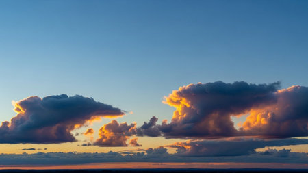 Dramatic sunset clouds are illuminated with vibrant orange and yellow light against a clear blue sky at twilight.