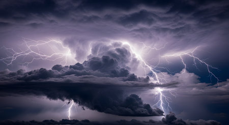 Captivating view of lightning bolts striking through dark clouds, creating an electrifying atmosphere in the night sky, highlighting nature's powerful beauty and intensity.