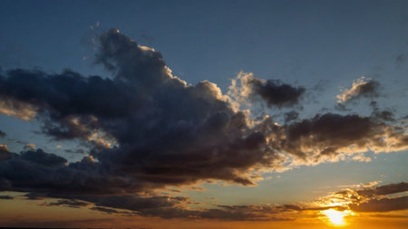 Beautiful sky painted by the sun leaving bright golden shades.Dense clouds in twilight sky in winter evening.Image of cloud sky on evening time.Evening sky scene with golden light from the setting sun