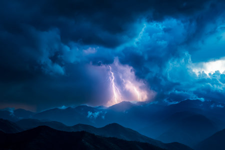 Lightning in the sky with stormy clouds and mountains in the background