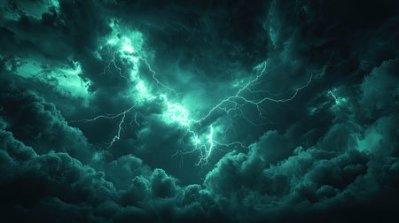 Teal lightning striking through dark stormy clouds