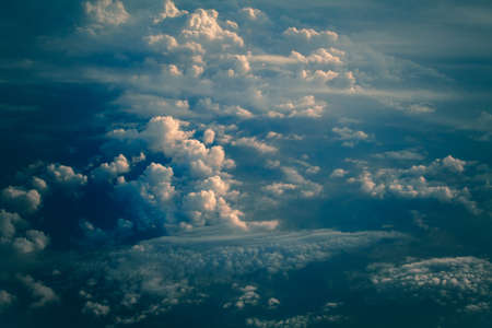 Fluffy white solar clouds in the twilight light float against the dark blue sky. Divine view. Concept and background dream, integrity, wholeness, unity, totality, Halloween.