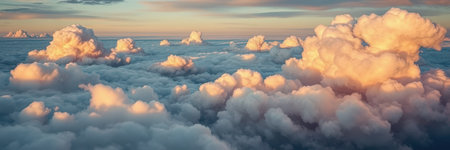 A panoramic view of a vast expanse of clouds illuminated by the warm glow of the setting sun