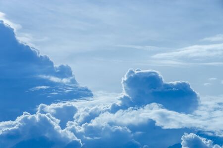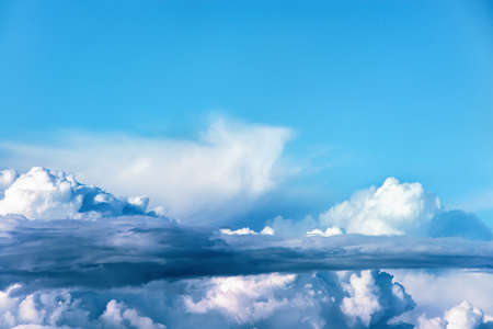 Cumulus white and gray clouds on a blue sky. Beautiful dreamy scene of air clouds on blue sky background.