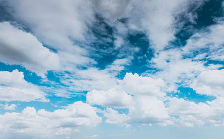 Beautiful blue sky and white cumulus clouds abstract background. Cloudscape background. Blue sky and fluffy white clouds on sunny day. Nature weather. Bright day sky for happy day background.