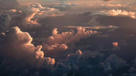 Purple showing dramatic sunset sky with golden luminous clouds and dark purple horizon layers viewed from above the...