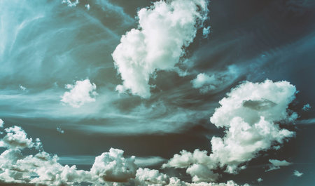 White cumulus clouds in the blue sky. cloudy sky background. Aesthetics of vintage film.