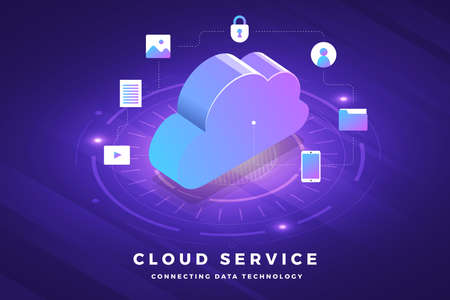 Isometric illustrations design concept technology solution on top with cloud service. Gradient background and digital graph chart thin line. Vector illustrate.