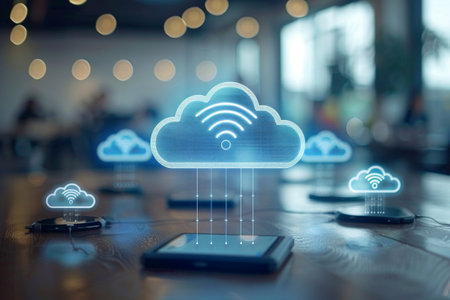 Glowing, digital cloud icon is featured prominently over a complex network of circuit board patterns. The circuit board is highlighted in vibrant shades of orange and blue, while the cloud icon itself is rendered in a detailed, textured blue hue, conveying a sense of technological advancement and digital integration.