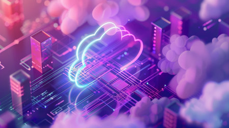 Cloud computing digital concept with neon circuitry and 3d rendered clouds