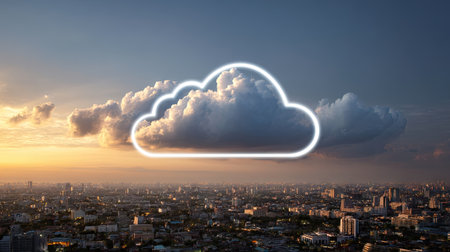 Digital cloud computing concept with glowing connections, surrounded by clouds in a futuristic setting. Technology and innovation background.