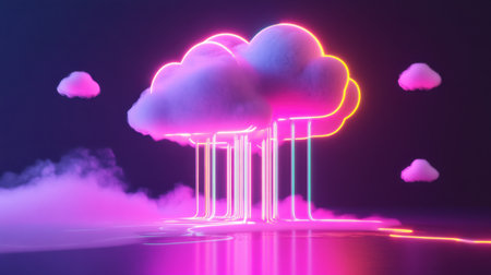 A 3D illustration of a cloud computing network, depicting data storage and digital transformation. Neon lights illuminate the scene.