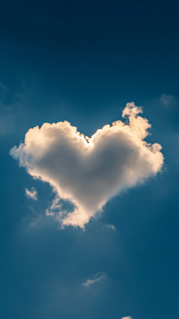 A solitary heart-shaped cloud floats serenely against a vast, clear blue sky. The fluffy white cloud forms a perfect heart, symbolizing love and tranquility. The image captures a moment of peaceful beauty and natural artistry.
