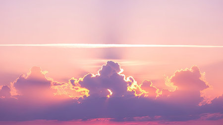 An AI generated illustration of a bright sunset in the horizon over the fluffy clouds