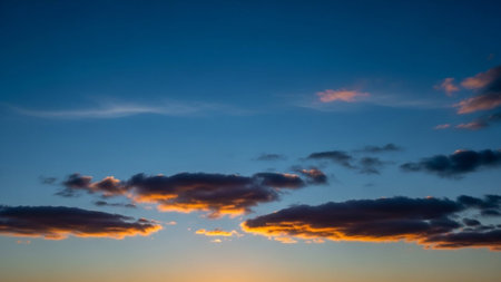A deep blue sky transitions to warm orange hues at the horizon, with dark, textured clouds and wispy streaks.