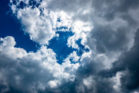 Dramatic sky, light from heaven. Cumulus stormy clouds in summer