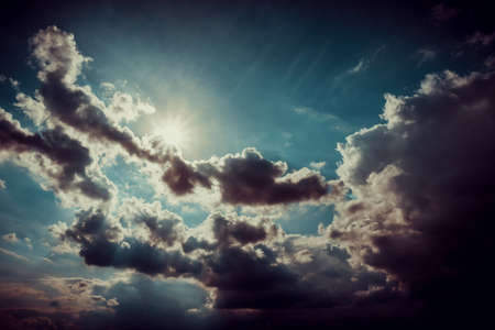 Beautiful sky with volumetric clouds, and the rays of the sun. For any purpose