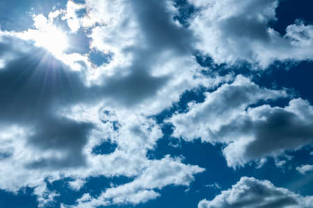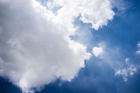 White clouds against a bright blue sky. Change from clear sunny weather to cloudy. Wallpaper for news about weather forecast. Clearing after rain. Religious appeal to the Almighty. Feeling of infinity