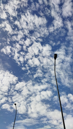 Streetlights stand tall under a vibrant blue sky filled with fluffy white clouds creating a peaceful and open atmosphere perfect for outdoor and urban settings.