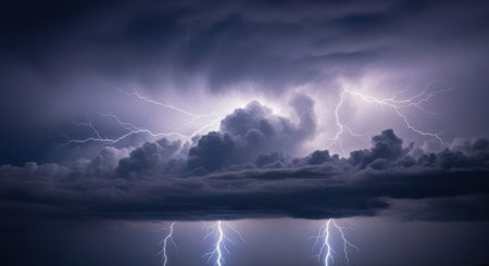 Bright lightning forks across dark storm clouds, creating a dramatic and electrifying atmosphere.