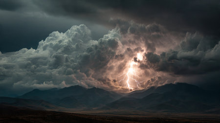 Lightning in the sky with stormy clouds and mountains in the background