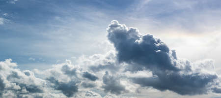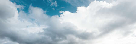 Wide sky panorama with scattered cumulus clouds bilding up before storm. Dramatic sky background