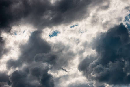 Dark storm clouds make the sky in black. The rain is coming soon. Beautiful heaven with dramatic light, sometimes heavy clouds mass charged. Abstract nature background.