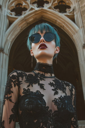 Stylish Woman with Blue Hair Against Gothic Church Backdrop