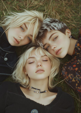Three young women with short, stylish haircuts are lying side by side in a grassy field. They all have their eyes closed, sharing a serene moment in nature.