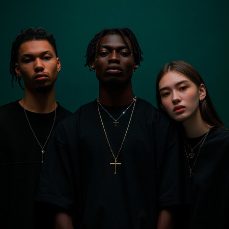 Portrait of a young african american man in a black T-shirt and two caucasian women posing in the studio.
