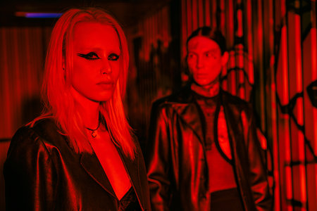 Intense portrait of a person with dramatic makeup, dark spiked hair, and a leather jacket with spikes. Background hues are purple and pink, enhancing the moody atmosphere