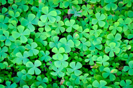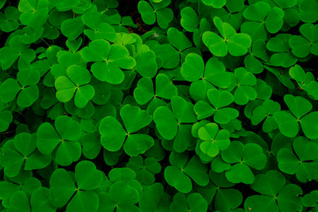 Close-up of real leaf clover on green shamrock field background. Clovers grass texture. Abstract natural leaves in the forest with copy space, top view.