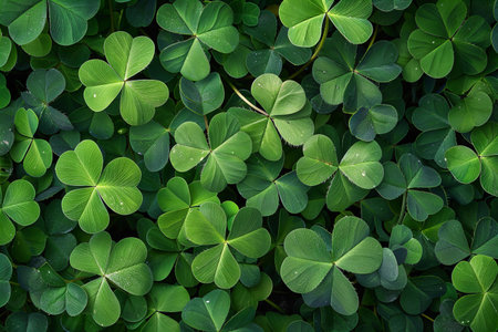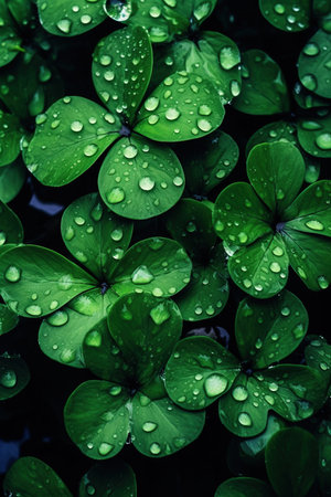 Covering green clover leaves, numerous small drops of dew create a stunning natural pattern, sparkling in the gentle morning light and enhancing the beauty of the garden
