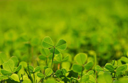 Lucky Irish Four Leaf Clover in the Field for St. Patricks Day holiday symbol. with three-leaved shamrocks.