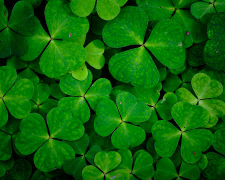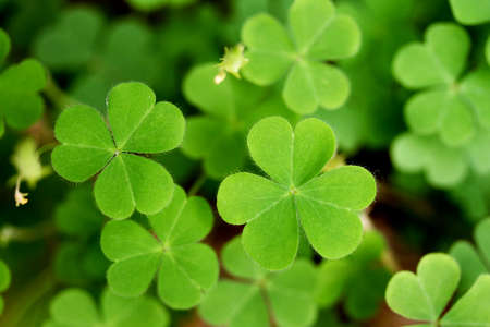 Close up shamrock clovers meadow concept photo. Three leaf plants with dark center. Front view photography with blurred background. High quality picture for wallpaper, travel blog, magazine, article