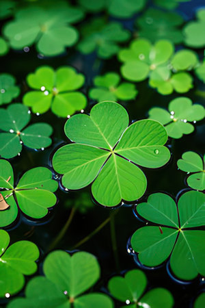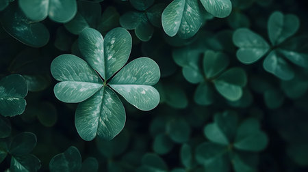A lively four-leaf clover showcases intricate vein patterns against a rich green backdrop, evoking themes of fortune and harmony in a serene, nature-filled setting.