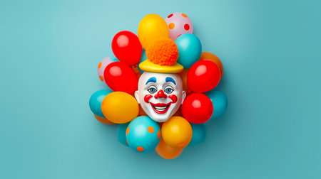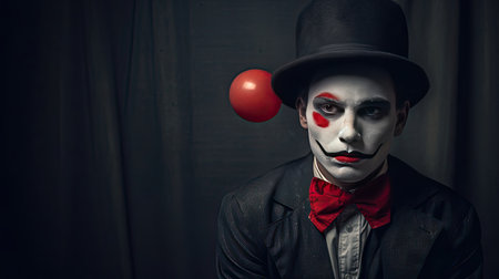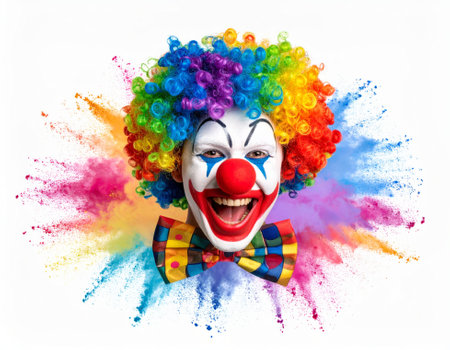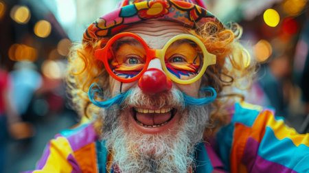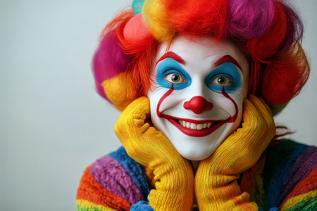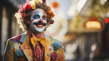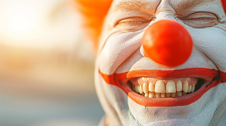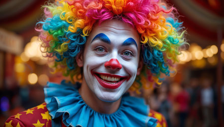 Colorful clown portrait on blurred background with space for text, creating a joyful atmosphere.