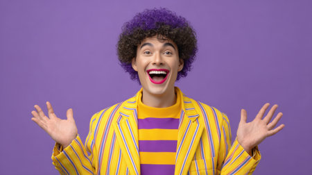 A joyful individual with vibrant curly hair dressed in a bright striped outfit poses energetically against a solid purple backdrop, radiating positivity.