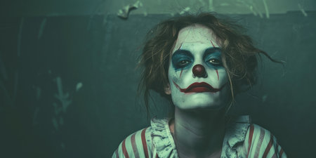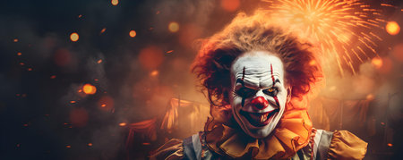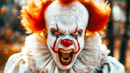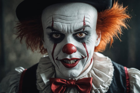 Scary creepy smiling clown circus jester joker villain carnival murderer horror halloween adult man evil expression make-up bizarre dark actor spooky monster face sinister dressed staring frightening