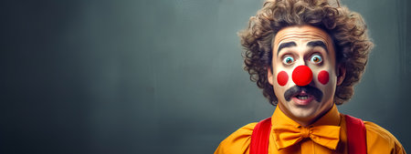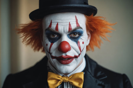 clown with an astonished expression, wearing a yellow shirt with a red bow, against a neutral background, capturing a moment of surprise or comedic shock