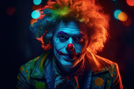 Portrait of a clown in a colorful wig. Clown on a dark background.